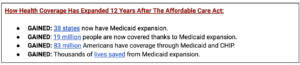 Twelve years ago, the Affordable Care Act (ACA) became the law of the land and millions of Americans gained lifesaving coverage as a result. Thanks to the ACA, 19 million Americans have gained coverage through Medicaid expansion and a total of one in four Americans has coverage through Medicaid or CHIP. Once viewed as a safety net, Medicaid has evolved to demonstrate the overwhelming need and desire for affordable health coverage. Without question, Medicaid has become pillars of the American health care system.