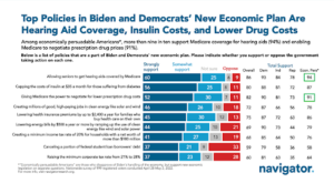 New polling from Navigator confirms broad support for Democrats’ economic plan to lower costs for the American people. Overall, 67 percent of voters support the package, including 88 percent of Democrats, 66 percent of independents, and 42 percent of Republicans. According to Navigator, voters report that out of all of the policies in the plan, voters’ top priorities are capping insulin costs, giving Medicare the power to negotiate drug prices, and extending hearing benefits to seniors. Roughly six in 10 voters reported concern that Republican control meant costs would keep going up, particularly as they are blocking lower drug prices and have voted against lower health care premiums.