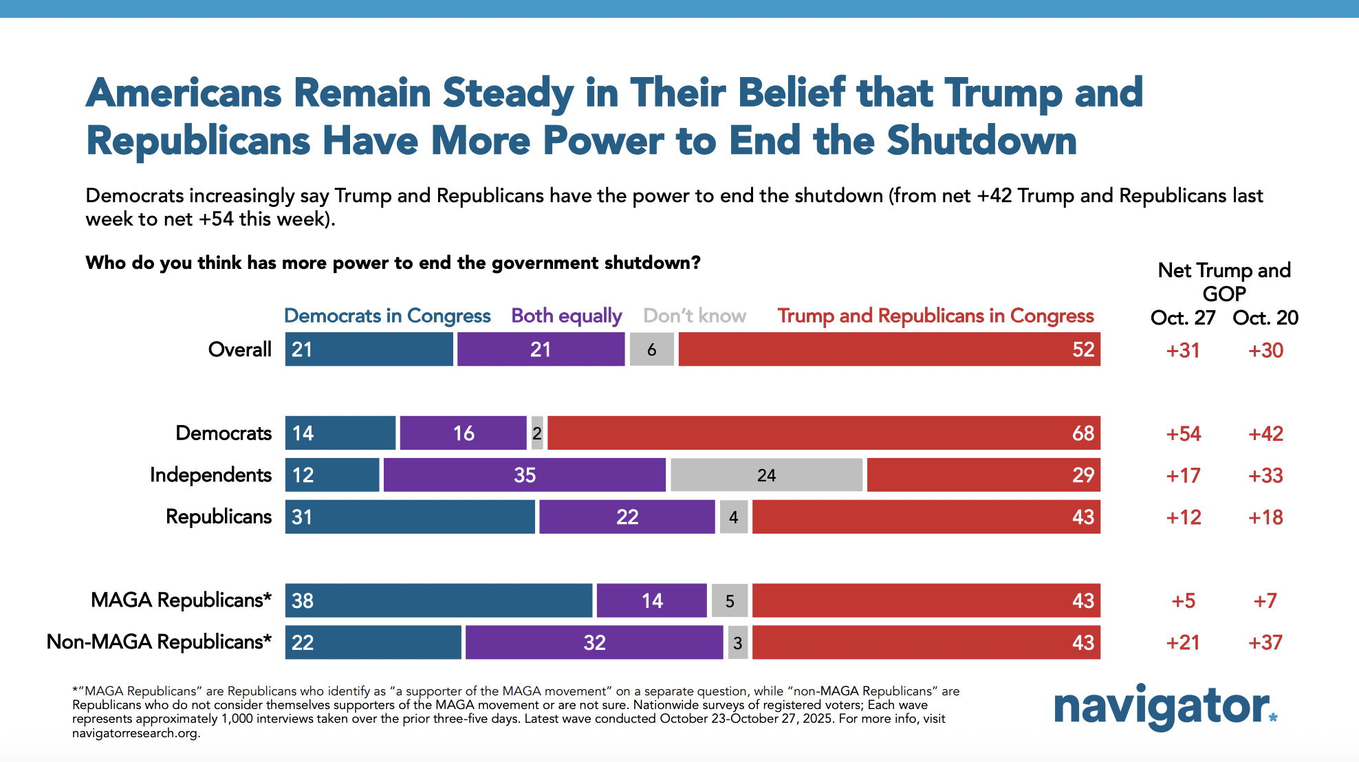 New polling from Navigator confirms what local and national headlines have been saying: the pressure is boiling over as Americans point fingers squarely at Donald Trump and Republicans for the government shutdown and the health care crisis they manufactured. Health care is firmly front and center, dominating conversations across the country. With open enrollment about to be underway and families facing skyrocketing costs, it’s time for action, not excuses. Republicans picked this fight, and now voters demand they end their health care shutdown, reopen the government, and stop playing games with people’s lives.