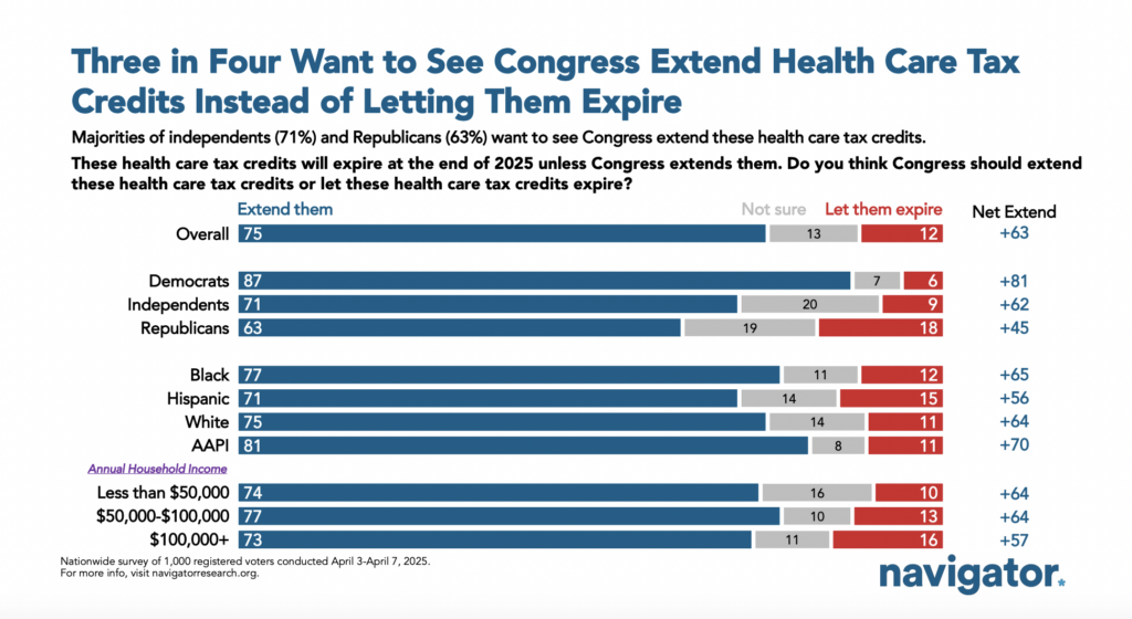 A Majority Want to See the Tax Credits Extended. 75 percent of Americans want Republicans in Congress to extend the health care tax credits, including 71 percent of Independents and 63 percent of Republicans.
