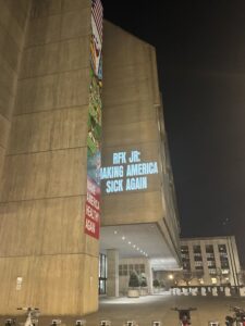 Washington D.C. – On Tuesday night, Public Health Watch, a project of Protect Our Care, projected massive rotating messages onto the U.S. Health and Human Services headquarters that read “Measles HQ” and “RFK Jr.: Making America Sick Again” — marking the tragic yet avoidable milestone of 12 straight months of measles transmission in the U.S., which now threatens the nation’s measles elimination status. The effort was first reported by The Hill. Measles outbreaks are now reported in at least 9 states — most severely in South Carolina, where confirmed cases now top 640, almost exclusively among unvaccinated children. The projection ads followed an event hosted by Public Health Watch with Hawaii Governor Josh Green, M.D., Dr. Demetre Daskalakis, and Dr. Annie Andrews to urge missing-in-action Trump HHS Secretary Robert F. Kennedy Jr. to stop ignoring the crisis and making matters worse.